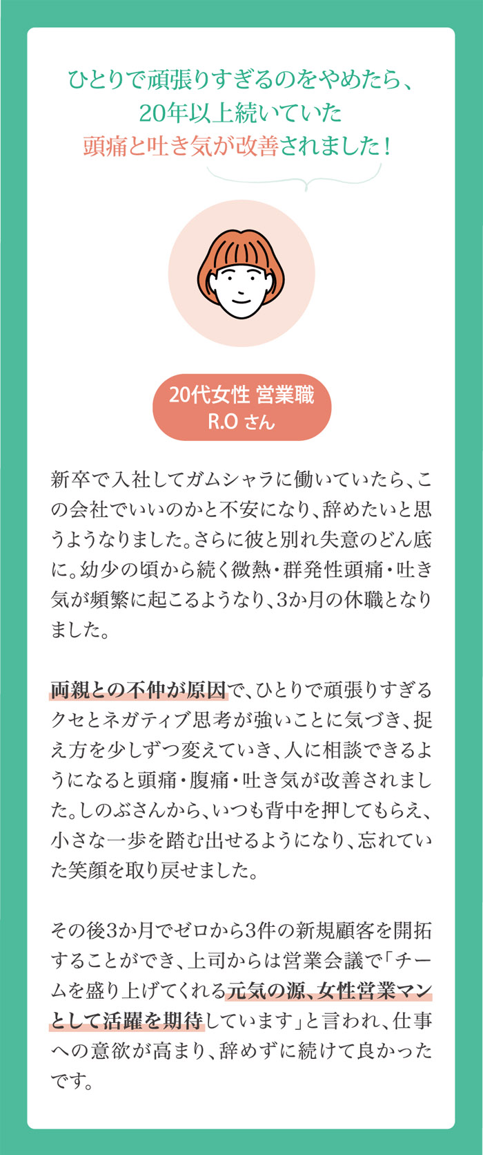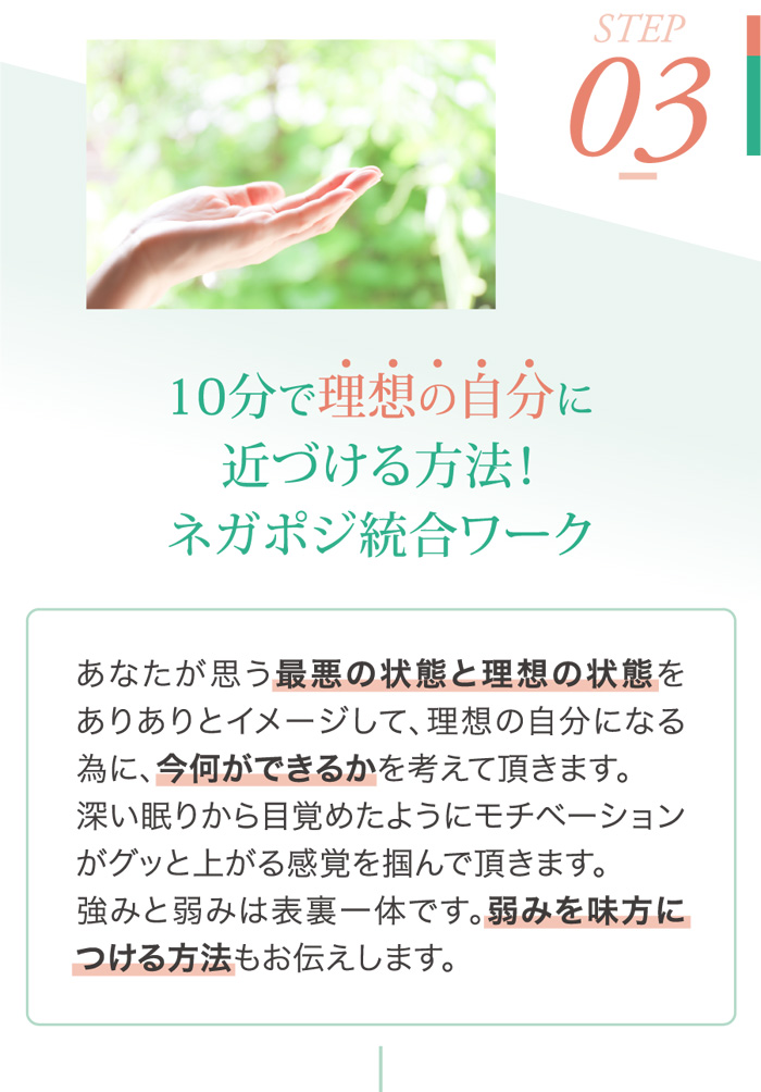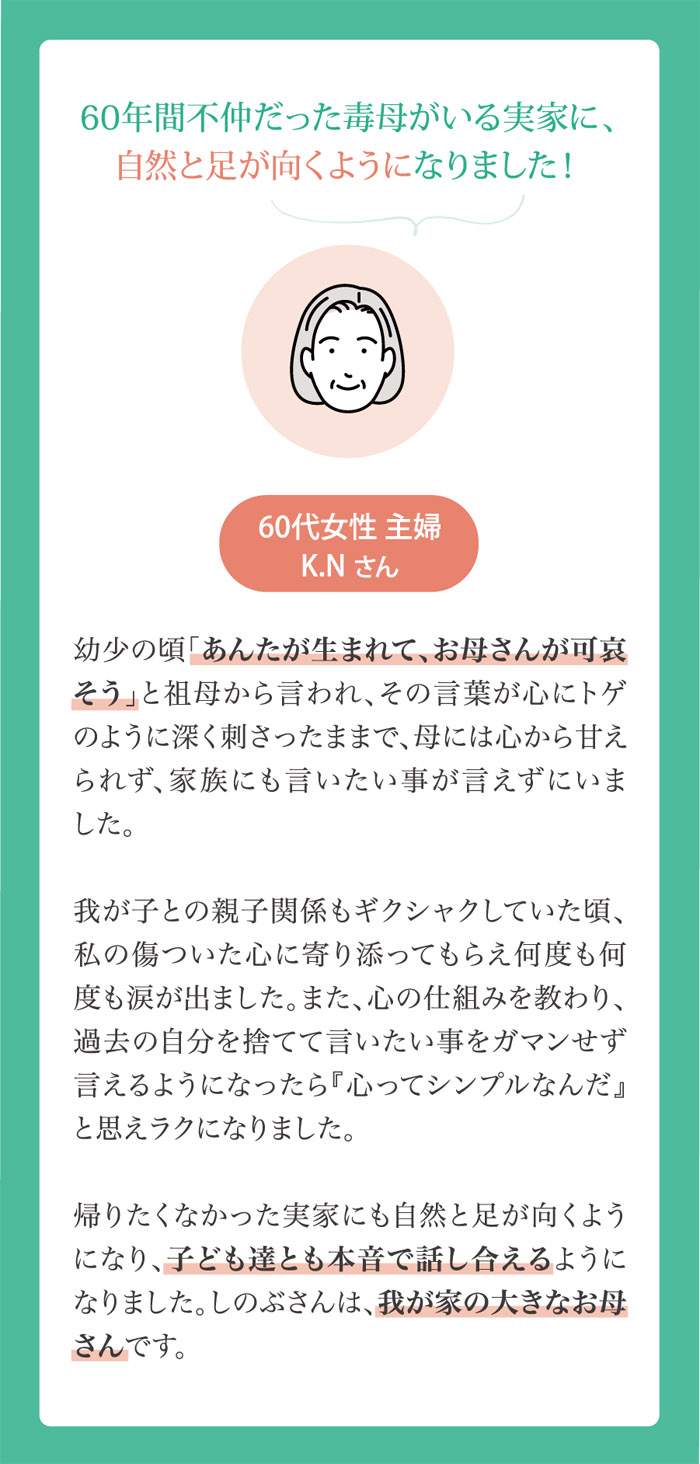 最後に 10年間メンタルケアとキャリア支援の経験から、幼少期の母の大きな愛で包まれ守られているという安心感と充足感が、人の健全な心の成長に重要であると確認しています。 あなたの人生は、誰かのものではなく、大切なご自身の人生です。 あなたを幸せにしてあげられるのは、あなただけ! 望む現実を創り、未だ見ぬ輝く未来を手に入れてほしい! そんな願いを込めて、プログラムを体系化しました。 あなたの叶えたい未来を全力でサポートします